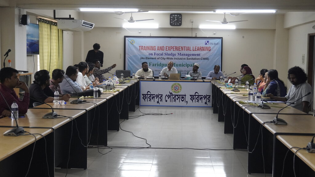 WASH professionals from multiple organizations joined an exposure visit to Faridpur Municipality, a CWIS Mentor City, to gain hands-on lessons on Fecal Sludge Management (FSM). The event was facilitated by ITN-BUET on May 20, 2025 for 19 trainees to enrich practical understanding of urban sanitation systems.