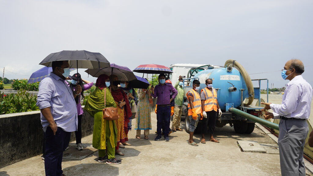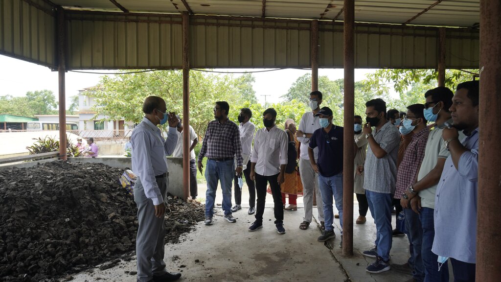 During the visit, participants observed a live demonstration of FS collection, transportation and desludging to the Fecal Sludge Treatment Plant (FSTP) using Vacutug. Mr. Alam explained to the participants about the unplanted drying bed system and its role in separating solid and liquid parts. The participants were then introduced to the co-composting facilities.