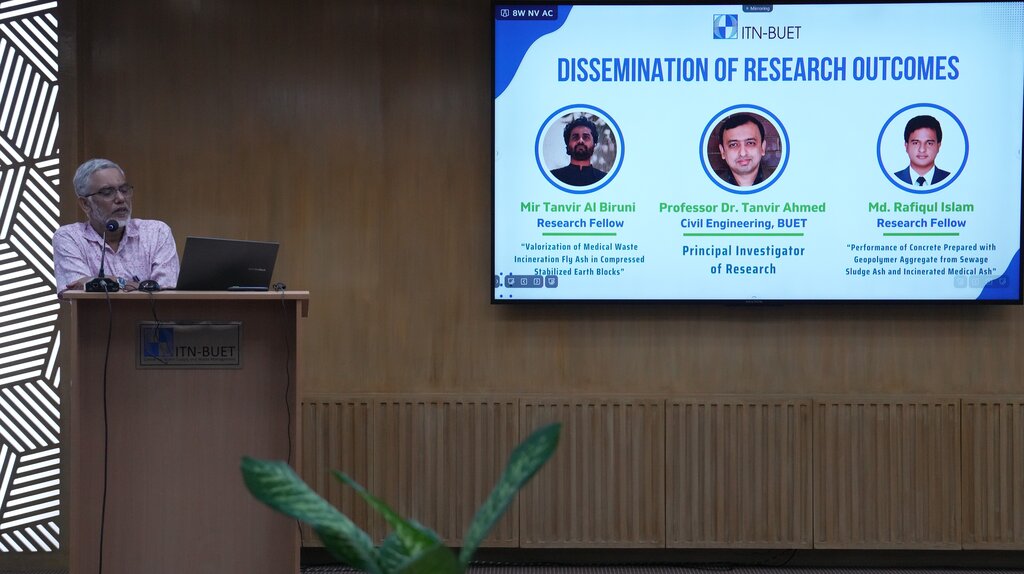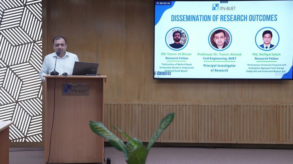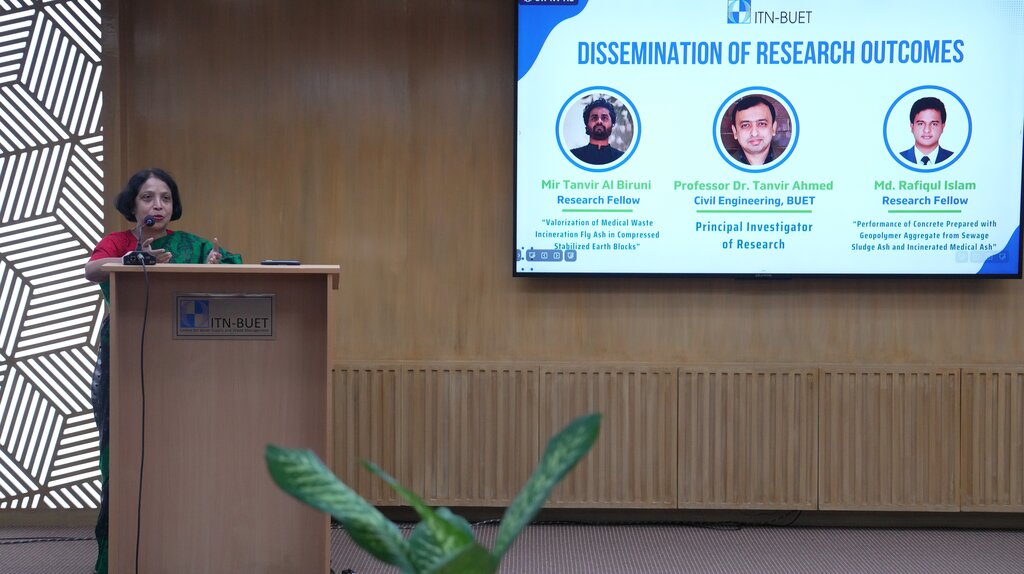ITN-BUET organized a dissemination event on Saturday, 26 July 2025, showcasing its two pioneer research projects to explore the utilization of industrial by-products, such as medical waste incineration ash, sewage sludge ash, and coal fly ash, for compressed stabilized earth blocks (CSEB) and production of sustainable concrete using geopolymer artificial coarse aggregates. The event brought together researchers, academics, and professionals from the relevant sectors for a day of knowledge exchange and discussion.