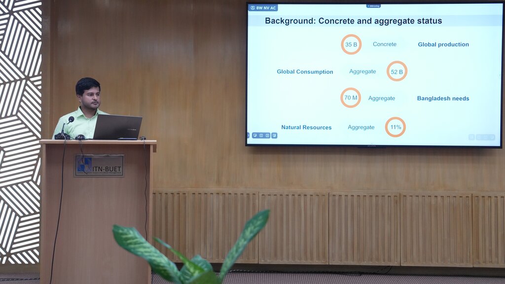 Mr. Md. Rafiqul Islam, another Research Fellow at ITN-BUET, presented findings from his research titled “Performance of Concrete Prepared with Geopolymer Aggregate from Sewage Sludge Ash and Incinerated Medical Ash.” He mentioned that the research had the potential of reducing reliance on conventional brick aggregates by producing high-strength, fire-resistant concrete using geopolymer aggregates with lower carbon emissions.
