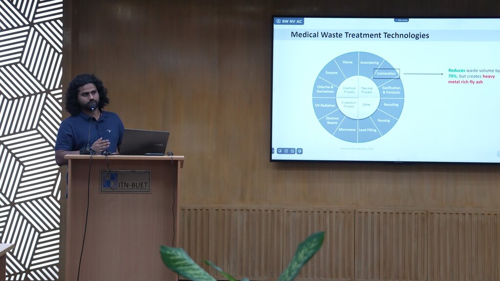 At the dissemination event, Mir Tanvir Al Biruni, Research Fellow at ITN-BUET, shared insights from his research on “Valorization of Medical Waste Incineration Fly Ash in Compressed Stabilized Earth Blocks.” He noted that his research promotes the sustainable reuse of hazardous medical waste into a durable, low-cost, and eco-friendly building material. This approach offers a viable alternative to conventional materials while reducing dependency on cement. His work also emphasizes the conservation of fertile topsoil, reduced landfill use, and support for circular economic practices in the construction sector.
